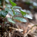 放ったらかしで自由だなぁ。刈り込みもしないで、種から伸びるに任せたチャノキの枝ぶりはひょろひょろと貧弱ですが、自然な姿です。2メートルも3メートルも伸び、好きなだけ花を咲かせています。ほんとうに沢山の花。種もぽろぽろこぼれまくるので、道の脇にはお茶の芽がたくさん萌え出ていました。杉の林、そのかたわらに棕櫚。その脇に茶の木が実を結んで種を落とす。春に芽が出て根を下ろし、夏を過ぎて秋。下の写真の右に茶の木、その下の新芽がわかるでしょうか? お祀りの碑の脇で、何か循環のようなものを感じさせる、お茶のもともとの姿が現れているようで、手を合わせました。